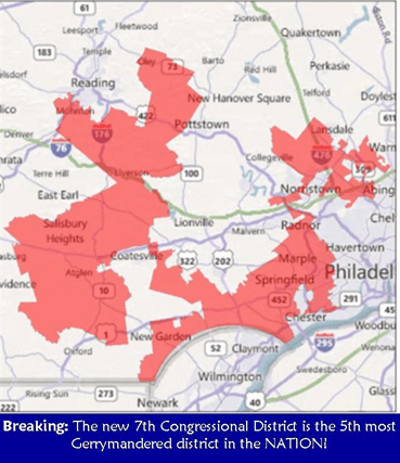 Well, we knew the Republican-dominated PA State govt. was going to stretch the bounds of sense and reason (hey, they’re Republicans, that’s what they do) in the 2010 redistricting, but this gerrymandering of the 7th District (of which Chadds Ford is part) is outrageous even coming from the likes of Dom Pileggi and Co. In a wonderful Christmas present for party-line incumbent Republican Pat Meehan, Democratic areas of the 7th, such as Upper Darby were excised and rural areas of Chester, Lancaster and Berks county were added. Delco Dems chair David Landau says of the new district, “It looks like an oil spill…we now have Amish farmers crammed in with the inner ring suburbs.”